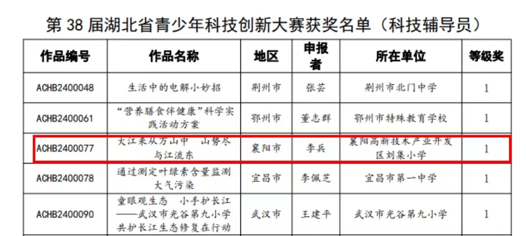 襄陽(yáng)高新區(qū)劉集小學(xué)在第38屆青少年科技創(chuàng)新大賽中獲佳績(jī)
