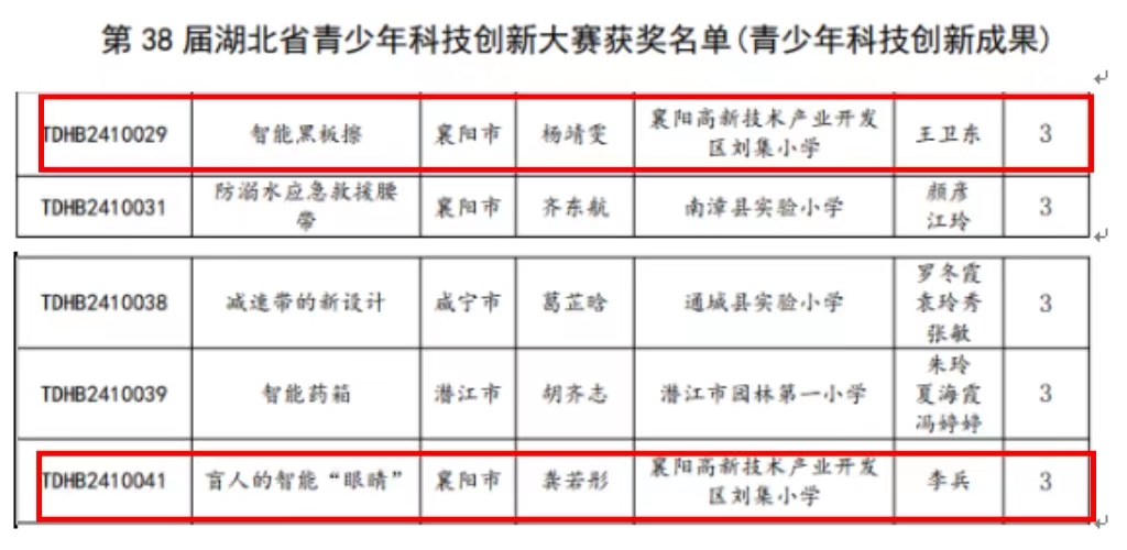 3月29日,襄陽(yáng)高新區(qū)劉集小學(xué)師生參加湖北省第38屆青少年科技創(chuàng)新大賽。4月10日,獲獎(jiǎng)名單公示,其中《大江來(lái)從萬(wàn)山中 山勢(shì)盡與江流東》項(xiàng)目榮獲科技輔導(dǎo)員創(chuàng)新成果一等獎(jiǎng),《智能黑板擦》《盲人的智能“眼睛”》榮獲青少年科技創(chuàng)新成果三等獎(jiǎng)。